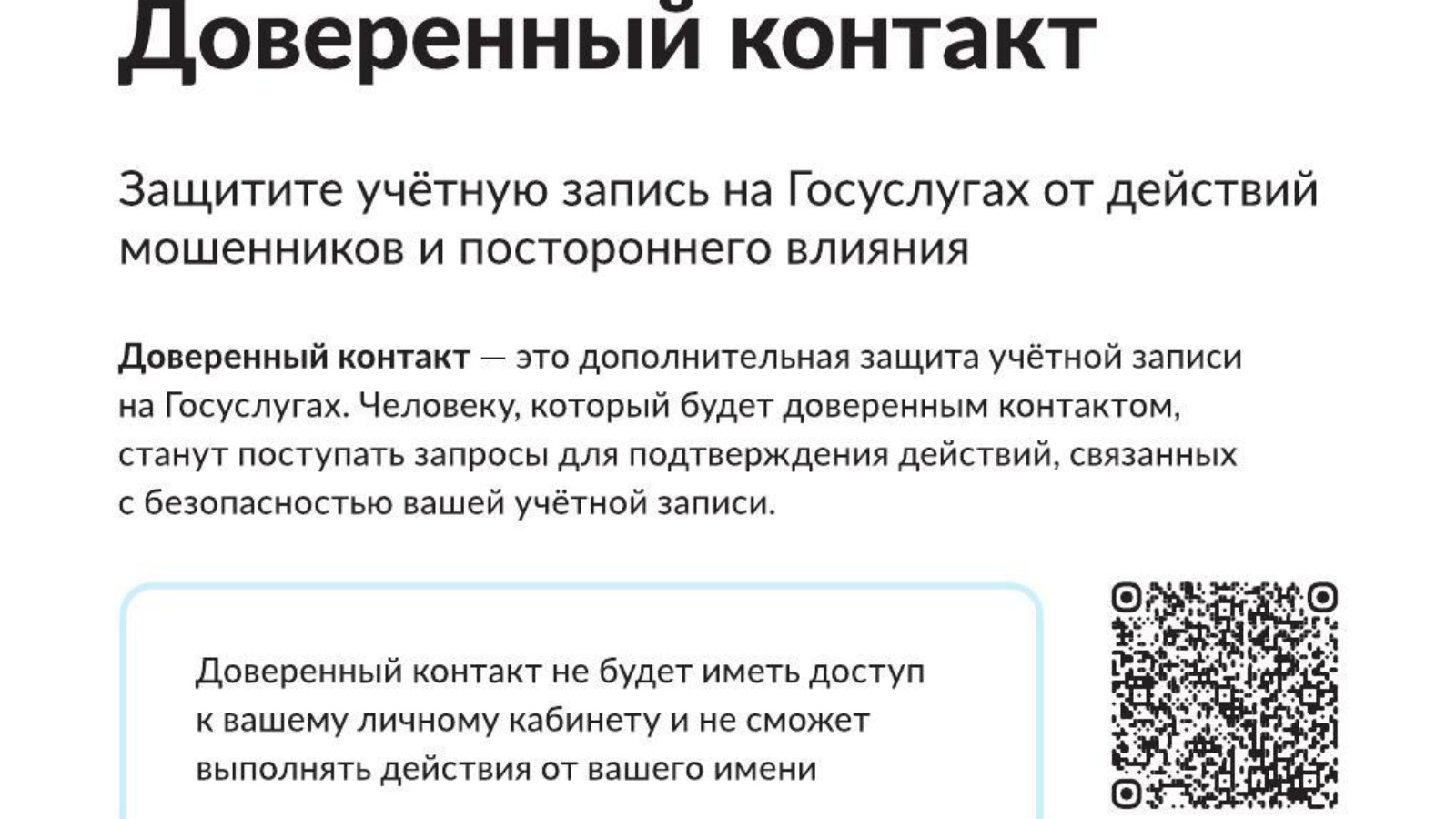 «Ышанычлы элемтә " - өстәмә яклауның инновацион механизмы, ул чакта сез сайлаган ышанычлы зат дәүләт хезмәтләрендә Сезнең хисап язмагызның куркынычсызлыгына бәйле гамәлләрне раслау өчен запрослар алачак. Шул ук вакытта ышанычлы зат кулланучының шәхси кабинетына керә алмый һәм аның исеменнән нинди дә булса гамәлләр башкара алмый.
